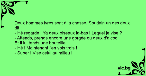 Deux hommes ivres sont à la chasse. Soudain un des deux dit :