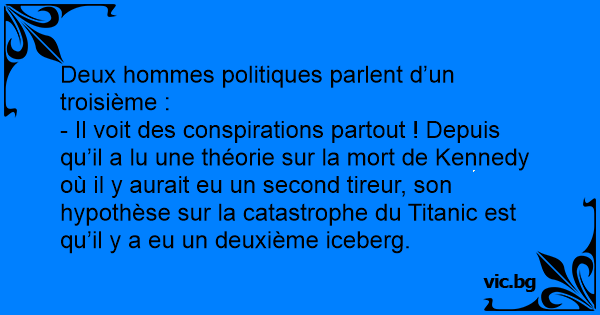 - Il voit des conspirations partout ! Depuis qu’il a lu une théorie sur la mort de Kennedy où il y aurait eu un second tireur, son hypothèse sur la catastrophe du Titanic est qu’il y a eu un deuxième iceberg.