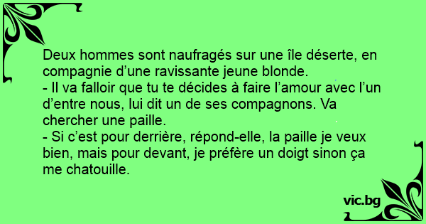 - Si c’est pour derrière, répond-elle, la paille je veux bien, mais pour devant, je préfère un doigt sinon ça me chatouille.