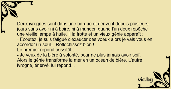 Alors le génie transforme la mer en un océan de bière. L'autre ivrogne, énervé, lui répond :