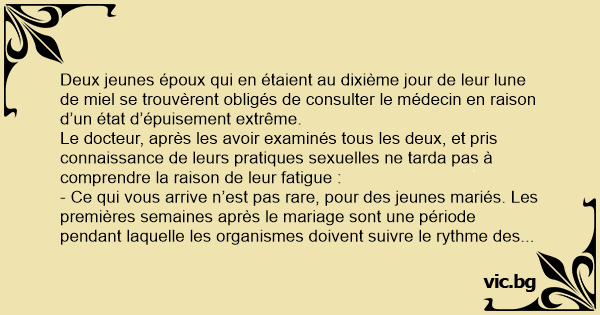 Deux jeunes époux qui en étaient au dixième jour de leur lune de miel se trouvèrent obligés de consulter le médecin en raison d’un état d’épuisement extrême.