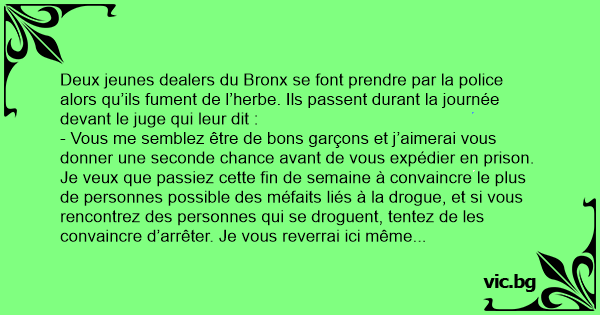 - Vous me semblez être de bons garçons et j’aimerai vous donner une seconde chance avant de vous expédier en prison. Je veux que passiez cette fin de semaine à convaincre le plus de personnes possible des méfaits liés à la drogue, et si vous rencontrez des personnes qui se droguent, tentez de les convaincre d’arrêter. Je vous reverrai ici même lundi pour faire le bilan.