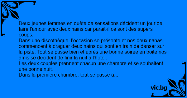 Dans une discothèque, l'occasion se présente et nos deux nanas commencent à draguer deux nains qui sont en train de danser sur la piste. Tout se passe bien et après une воnnе soirée en boite nos amis se décident de finir la nuit à l'hôtel.