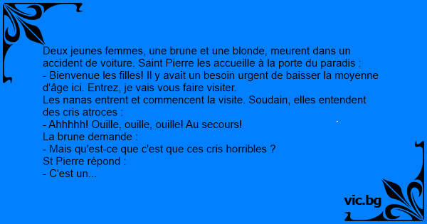C'est une fois une dame qui meurt. Elle monte au ciel et arrive devant St-Pierre assis sur un nuage et entouré d'anges... Il lui pose un tas de questions afin de savoir si elle est acceptée au...