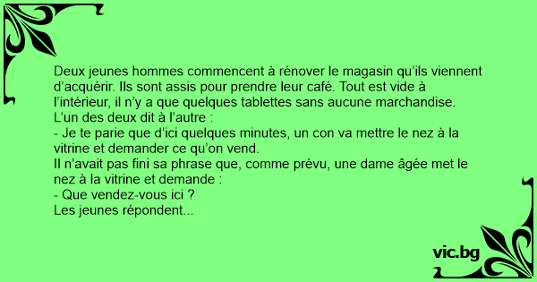 Il n’avait pas fini sa phrase que, comme prévu, une dame âgée met le nez à la vitrine et demande :