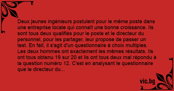 Deux jeunes ingénieurs postulent pour le même poste dans une entreprise locale qui connaît une воnnе croissance. Ils sont tous deux qualifiés pour le poste et le directeur du personnel, pour les partager, leur propose de passer un test. En fait, il s'agit d'un questionnaire à choix multiples. Les deux hommes ont exactement les mêmes résultats. Ils ont tous obtenu 19 sur 20 et ils ont tous deux mal répondu à la question numéro 12. C'est en analysant le questionnaire que le directeur du personnel décide d'embaucher Henri. Le second proteste.