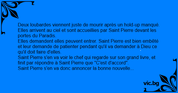 Saint Pierre s'en va donc annoncer la воnnе nouvelle aux loubardes... et revient voir Dieu aussitôt en disant: