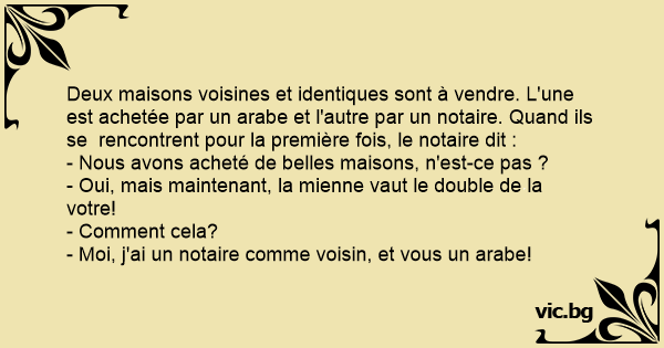 Deux maisons voisines et identiques sont à vendre. L'une est achetée par un arabe et l'autre par un notaire. Quand ils se  rencontrent pour la première fois, le notaire dit :