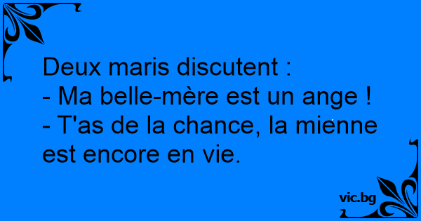 Deux copines se rencontrent. L'une dit à l'autre : - Moi j'ai de la chance ma belle mère est un ange. - Ah bon ! répond l'autre, la mienne est toujours en vie !