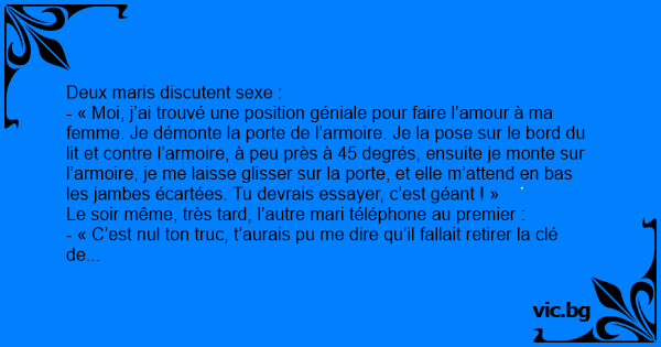 - « Moi, j’ai trouvé une position géniale pour faire l’amour à ma femme. Je démonte la porte de l’armoire. Je la pose sur le bord du lit et contre l’armoire, à peu près à 45 degrés, ensuite je monte sur l’armoire, je me laisse glisser sur la porte, et elle m’attend en bas les jambes écartées. Tu devrais essayer, c’est géant ! »