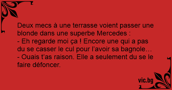 Deux mecs à une terrasse voient passer une blonde dans une superbe Mercedes :