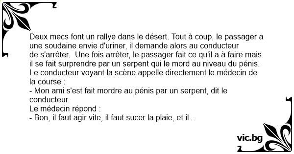 Deux mecs font un rallye dans le désert. Tout à coup, le passager a une soudaine envie d'uriner, il demande alors au conducteur de s'arrêter. Une fois arrêter, le passager fait ce qu'il a à faire mais il se fait surprendre par un serpent qui le mord au niveau du pénis. Le conducteur voyant la scène appelle directement le médecin de la course :