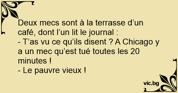 - T’as vu ce qu’ils disent ? A Chicago y a un mec qu’est tué toutes les 20 minutes !