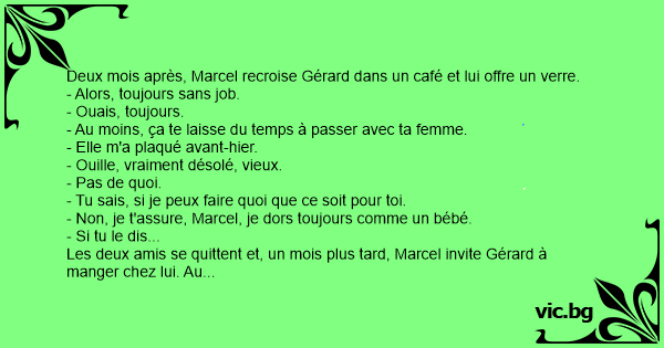 Deux mois après, Marcel recroise Gérard dans un café et lui offre un verre.