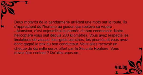 - Monsieur, c'est aujourd'hui la journée du bon conducteur. Notre hélicoptère vous suit depuis 200 kilomètres. Vous avez respecté les limitations de vitesse, les lignes blanches, les priorités et vous avez donc gagné le prix du bon conducteur. Vous allez recevoir un chèque de dix mille euros offert par la Sécurité Routière. Vous devez être content ? Qu'allez-vous en faire ?