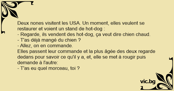 Deux nones visitent les USA. Un moment, elles veulent se restaurer et voient un stand de hot-dog :