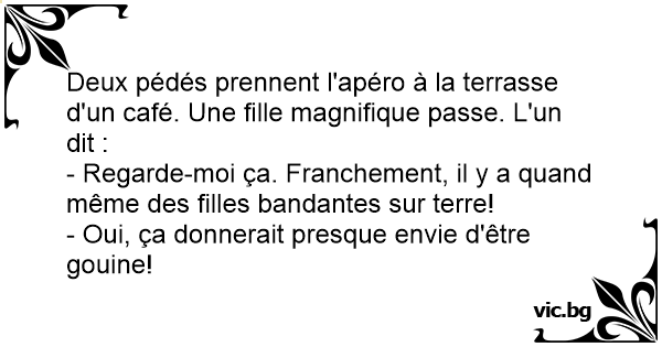 Deux pédés prennent l'apéro à la terrasse d'un café. Une fille magnifique passe. L'un dit :
