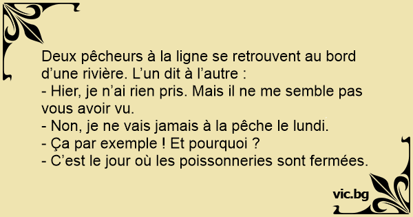 Deux pêcheurs à la ligne se retrouvent au bord d’une rivière. L’un dit à l’autre :