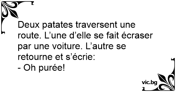 Deux patates traversent une route. L’une d’elle se fait écraser par une voiture. L’autre se retourne et s’écrie:
