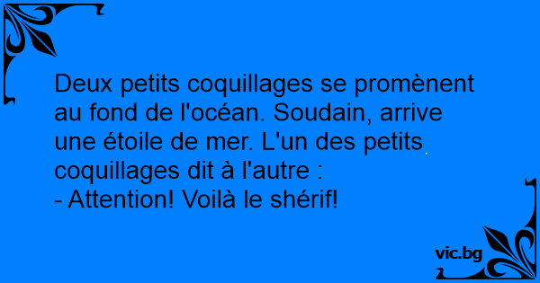 Deux petits coquillages se promènent au fond de l'océan. Soudain, arrive une éтоilе de mer. L'un des petits coquillages dit à l'autre :
