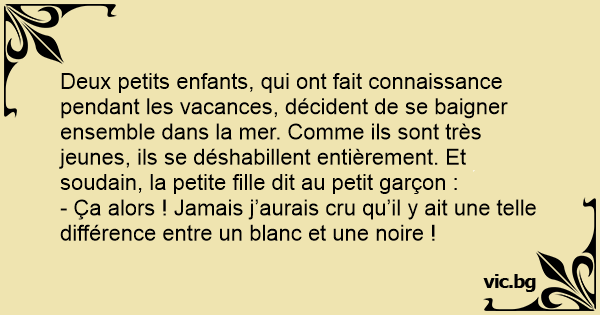Deux petits enfants, qui ont fait connaissance pendant les vacances, décident de se baigner ensemble dans la mer. Comme ils sont très jeunes, ils se déshabillent entièrement. Et soudain, la petite fille dit au petit garçon :