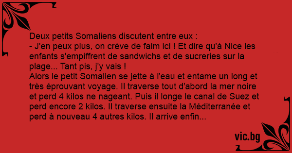 Alors le petit Somalien se jette à l'eau et entame un long et très éprouvant voyage. Il traverse tout d'abord la mer noire et perd 4 kilos ne nageant. Puis il longe le canal de Suez et perd encore 2 kilos. Il traverse ensuite la Méditerranée et perd à nouveau 4 autres kilos. Il arrive enfin complètement épuisé sur une des plages de Nice. Là, il se mélange à un groupe d'enfants. Il ne lui reste que la peau et les os, car il a perdu 10 kilos !
