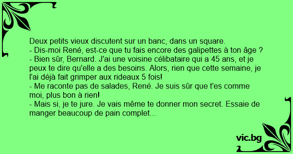 - Bien sûr, Bernard. J'ai une voisine célibataire qui a 45 ans, et je peux te dire qu'elle a des besoins. Alors, rien que cette semaine, je l'ai déjà fait grimper aux rideaux 5 fois!