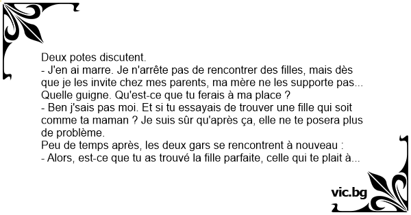 - J'en ai marre. Je n'arrête pas de rencontrer des filles, mais dès que je les invite chez mes parents, ma mère ne les supporte pas... Quelle guigne. Qu'est-ce que tu ferais à ma place ?