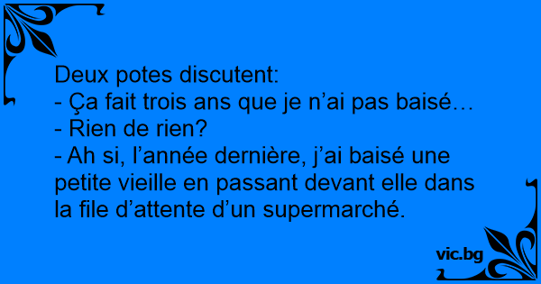 - Ah si, l’année dernière, j’ai baisé une petite vieille en passant devant elle dans la file d’attente d’un supermarché.