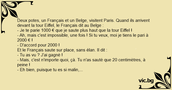 Deux potes, un Français et un Belge, visitent Paris. Quand ils arrivent devant la tour Eiffel, le Français dit au Belge :