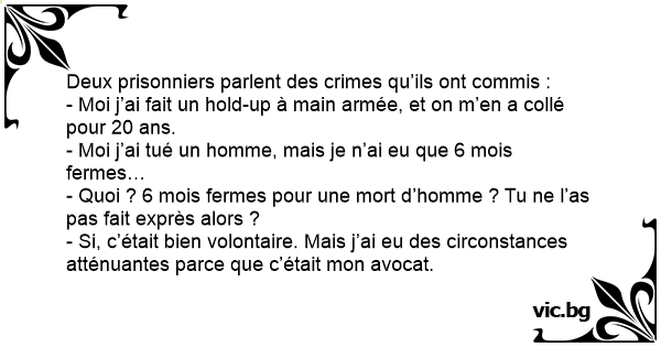 - Moi j’ai fait un hold-up à main armée, et on m’en a collé pour 20 ans.