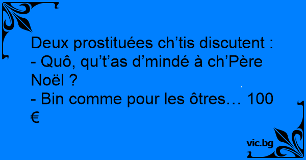 Две курви се срещат на улицата след Коледа и едната пита: Dos prostitutas están hablando en una esquina en plenas fiestas navideñas: Dialogo natalizio fra prostitute: ,"Ciao cara, tu cosa hai chiesto a Babbo Natale, quest'anno?","Cento euro, come a tutti gli altri!" Deux prostituées discutent. La première dit : -Ta demandé quoi au père noël ? La deuxième répond : - Bah... 50 euros comme tous les autres. Deux blondes se parlent: une blonde dit : qu'est que t'as demandé au père noël ? L'autre répond 20 euros comme à tout les autres... Une prostituée demande à une autre : - Qu'est-ce que t'as demandé au père-noël ? - Ben comme pour tout le monde... 300 euros ! Twee hoeren zitten samen in een kroeg. Zegt de ene hoer tegen de andere “Sinterklaas komt alweer bijna naar ons land” Het 2de hoertje vraagt “Wat ga jij dit jaar vragen aan Sinterklaas?” waarop de... Una prostituta chiede ad una collega: – Cosa hai chiesto quest’anno a Babbo Natale? – Bocca e culo! 100 euro come l’anno scorso !!! Una prostituta le pregunta a su compañera: - ¿Qué le has pedido a Papa Noel? - Lo mismo que a todos, 50 dólares!