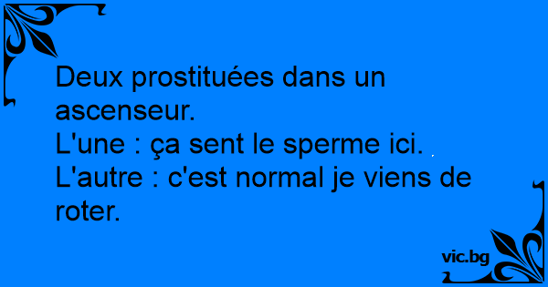 C’est deux prostituée dans l’ascenseur, l’une dit à l’autre : – Tu trouves pas que ça sent le sperme ? – Oh, excuse-moi j’ai roté !