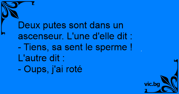 C’est deux prostituée dans l’ascenseur, l’une dit à l’autre : – Tu trouves pas que ça sent le sperme ? – Oh, excuse-moi j’ai roté !
