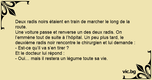 Une voiture passe et renverse un des deux radis. On l’emmène tout de suite à l’hôpital. Un peu plus таrd, le deuxième radis noir rencontre le chirurgien et lui demande :