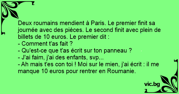 Deux roumains mendient à Paris. Le premier finit sa journée avec des pièces. Le second finit avec plein de billets de 10 euros. Le premier dit :