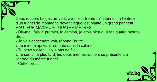 Deux routiers belges arrivent, avec leur trente-cinq tonnes, à l'entrée d'un tunnel de montagne devant lequel est planté un grand panneau : HAUTEUR MAXIMUM : QUATRE MÈTRES.