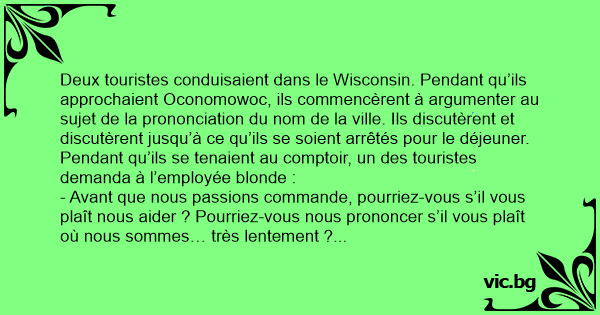 Deux touristes conduisaient dans le Wisconsin. Pendant qu’ils approchaient Oconomowoc, ils commencèrent à argumenter au sujet de la prononciation du nom de la ville. Ils discutèrent et discutèrent jusqu’à ce qu’ils se soient arrêtés pour le déjeuner.