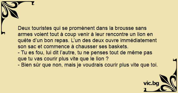 - Tu es fou, lui dit l’autre, tu ne penses tout de même pas que tu vas courir plus vite que le lion ?