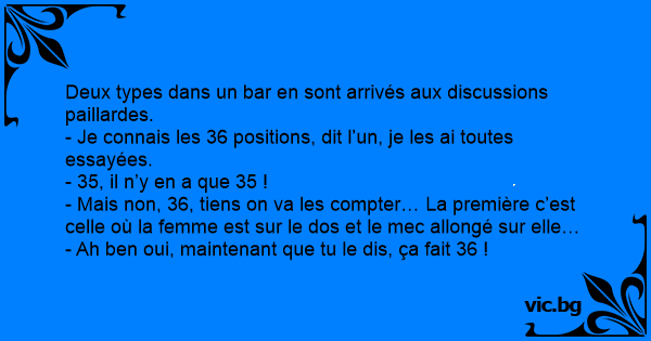 - Je connais les 36 positions, dit l’un, je les ai toutes essayées.