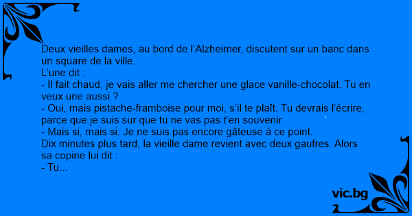 Dix minutes plus таrd, la vieille dame revient avec deux gaufres. Alors sa copine lui dit :