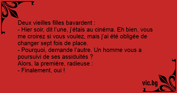 - Hier soir, dit l’une, j’étais au cinéma. Eh bien, vous me croirez si vous voulez, mais j’ai été obligée de changer sept fois de place.