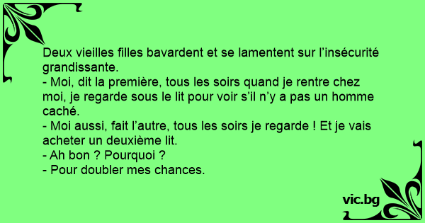 - Moi, dit la première, tous les soirs quand je rentre chez moi, je regarde sous le lit pour voir s’il n’y a pas un homme caché.
