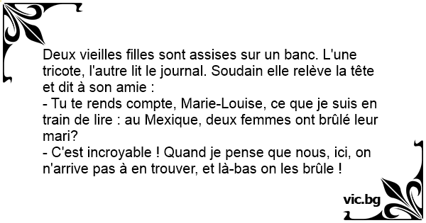 - Tu te rends compte, Marie-Louise, ce que je suis en train de lire : au Mexique, deux femmes ont brûlé leur mari?