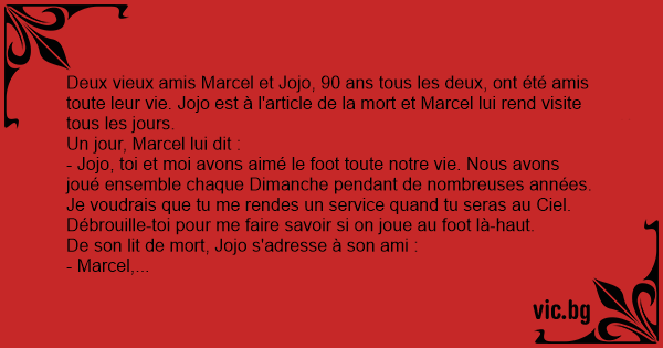 - Jojo, toi et moi avons aimé le foot toute notre vie. Nous avons joué ensemble chaque Dimanche pendant de nombreuses années. Je voudrais que tu me rendes un service quand tu seras au Ciel. Débrouille-toi pour me faire savoir si on joue au foot là-haut.