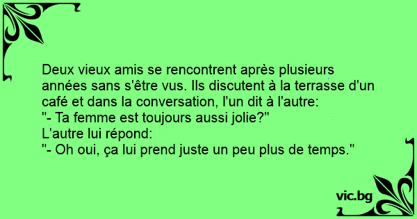 Deux vieux amis se rencontrent après plusieurs années sans s'être vus. Ils discutent à la terrasse d'un café et dans la conversation, l'un dit à l'autre: