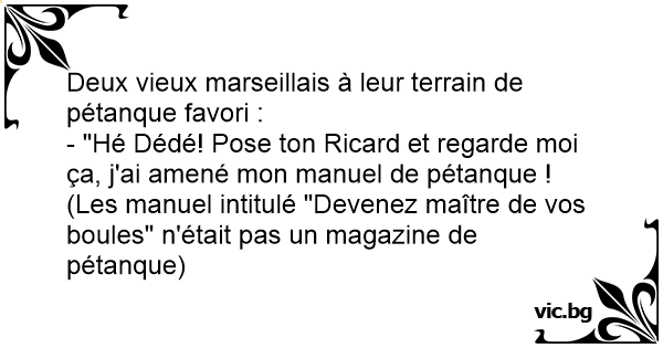 - "Hé Dédé! Pose ton Ricard et regarde moi ça, j'ai amené mon manuel de pétanque !