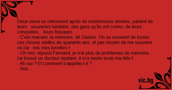 - Oh moi, répond Fernand, je n'ai plus de problèmes de mémoire... j'ai trouvé un docteur épatant, il m'a rendu toute ma tête !