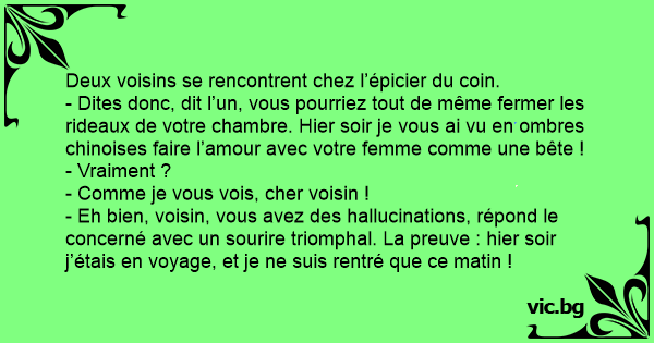- Eh bien, voisin, vous avez des hallucinations, répond le concerné avec un sourire triomphal. La preuve : hier soir j’étais en voyage, et je ne suis rentré que ce matin !