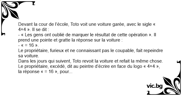 Le propriétaire, excédé, dit au peintre d’écrire en face du logo « 4×4 », la réponse « = 16 », pour avoir la paix.